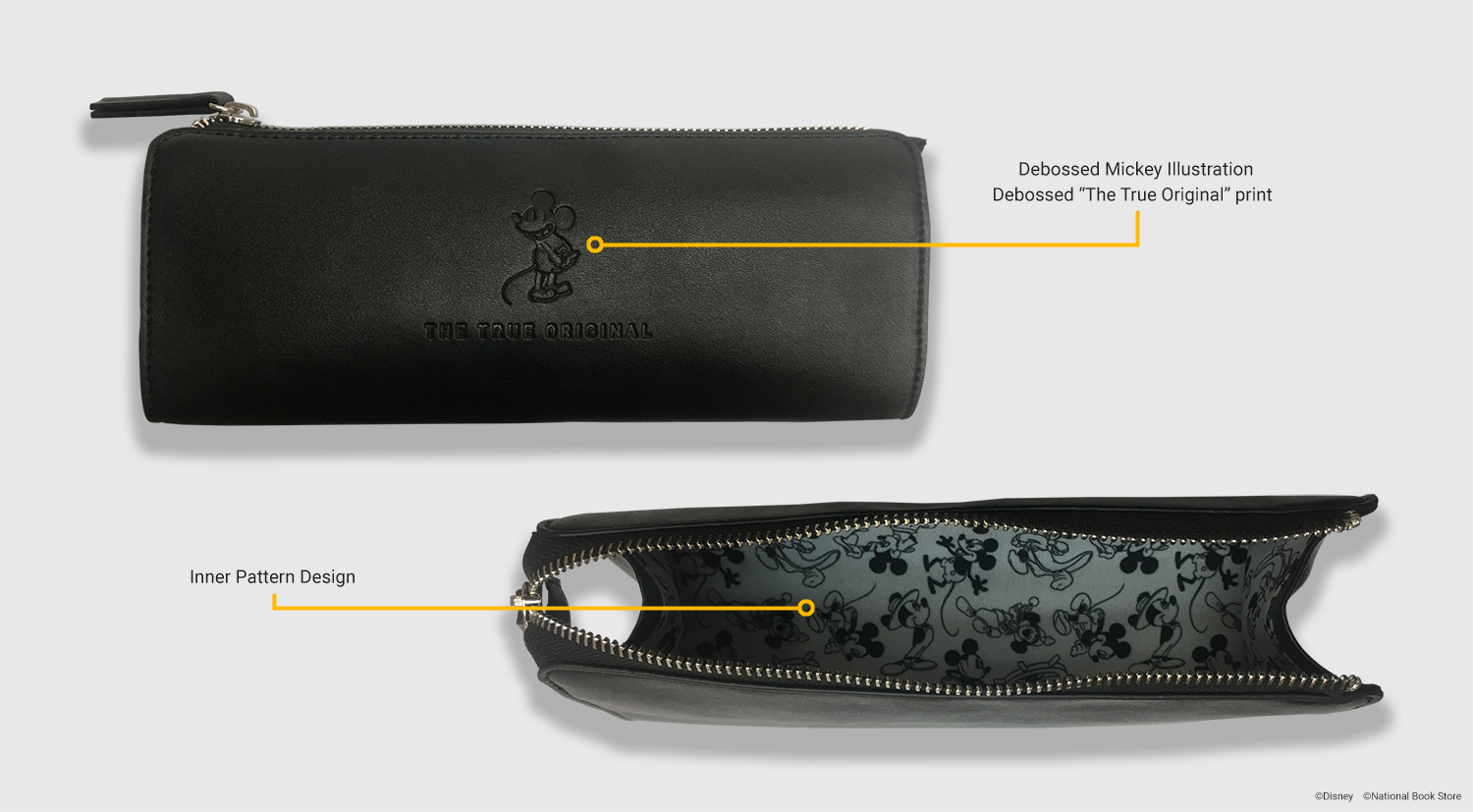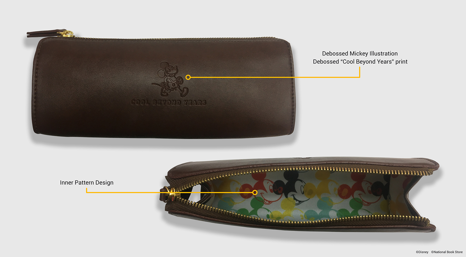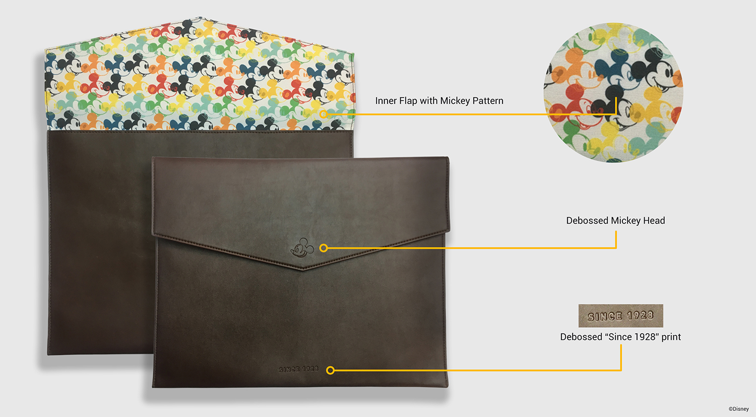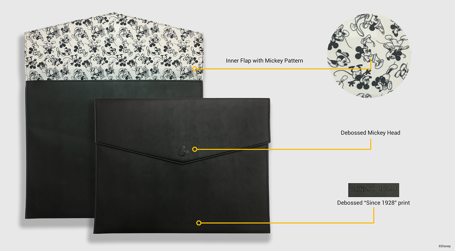 As part of the leather collection, I decided to incorporate a debossed Mickey icon on the exterior and playful inner patterns to bring more life to the design. The patterns showcase Mickey’s character designs throughout the years. I opted for a minimalist exterior to create a professional yet stylish look, balanced with a playful interior that reflects Mickey’s fun and lively personality.
